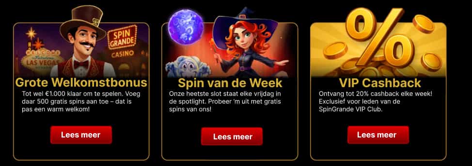 Bij SpinGrande Nederland zorgen regelmatige promoties voor extra spanning. Naast het welkomstpakket kun je rekenen op wekelijkse cashback, reloadbonussen en toernooien met indrukwekkende prijzen. VIP-spelers profiteren bovendien van snellere uitbetalingen, persoonlijke aanbiedingen en een toegewijde accountmanager.