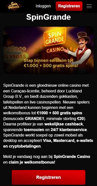 SpinGrande is een gloednieuw online casino met een Curaçao-licentie, beheerd door Luckland Group B.V., en biedt duizenden gokkasten, tafelspellen en live casinospellen. Nieuwe spelers uit Nederland kunnen beginnen met een welkomstbonus tot €1000 + 500 gratis spins (bonuscode GRANDE1; minimale storting €20). Daarna profiteer je van wekelijkse cashback, spannende toernooien en 24/7 klantenservice. SpinGrande werkt soepel op zowel mobiel als desktop en accepteert Visa, Mastercard, e-wallets en cryptobetalingen.